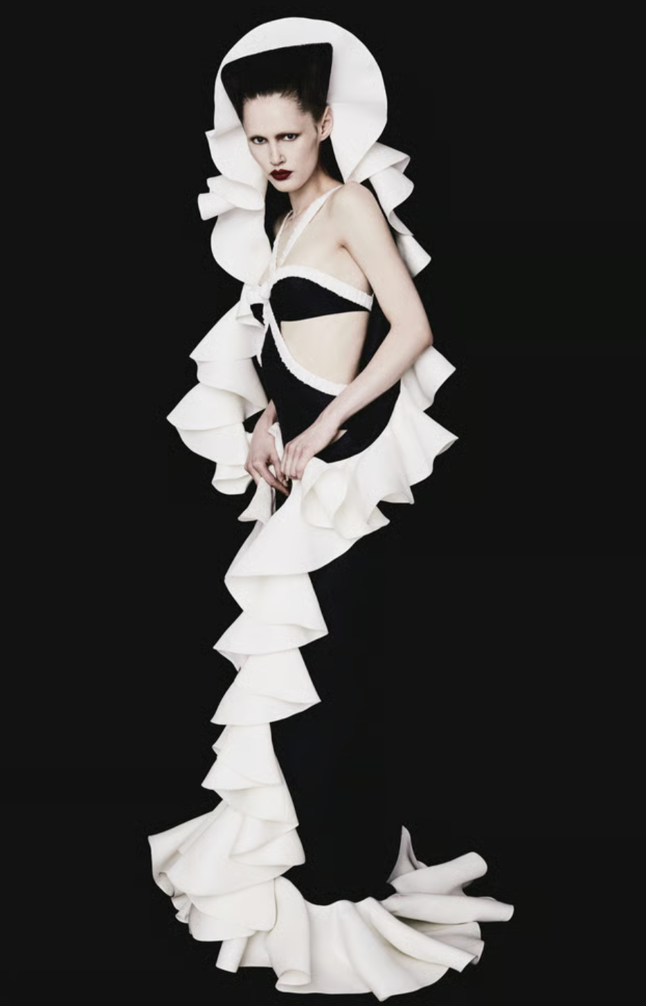 维克多&罗夫的系列作品常在浪漫与力量、张扬与克制、古典与叛逆之间制造张力,并以现代技术重新诠释这些对比。他们的标志性元素——蝴蝶结、荷叶边、刺绣与雕塑般的廓形——被融入拼布、激光切割与实验性面料工艺中,形成独树一帜的视觉语言。这种突破性的创作赢得了评论界的高度赞誉,也吸引了包括Lady Gaga、Madonna、Cardi B与Tilda Swinton在内的艺术家与名人追随。