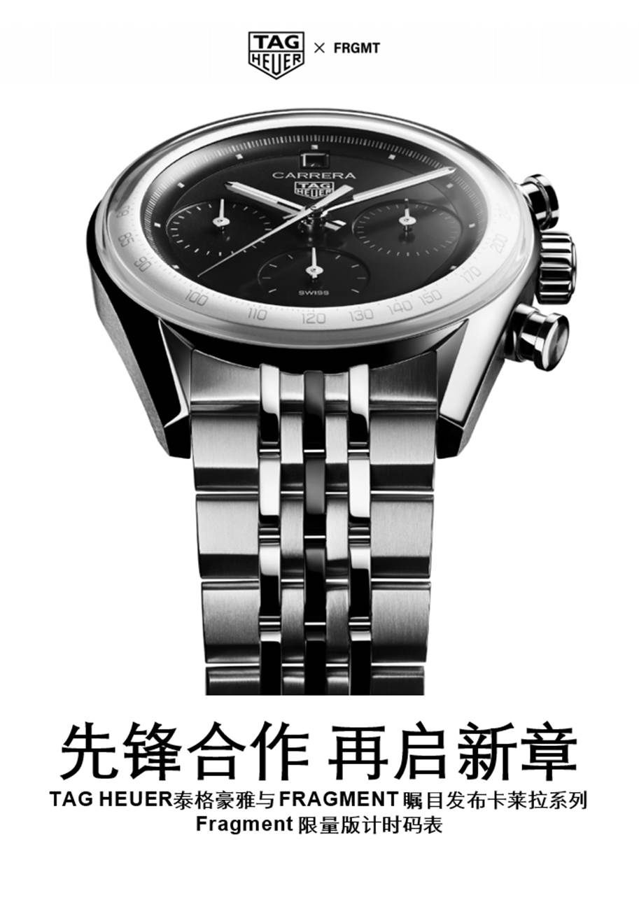 2018年,泰格豪雅与 Fragment 首度携手,即以泰格豪雅卡莱拉系列为创作蓝本,推出一款大胆简约的时计杰作,重塑了该系列的先锋型格。2020年,双方将合作目光转向泰格豪雅F1系列,通过更具冲击力的图形语言与视觉对比,诠释鲜明独到的设计主张。这两款时计均采用藤原浩标志性的黑白配色,一经问世便迅速成为收藏家竞相追捧的臻品。
