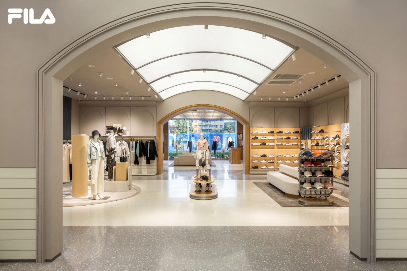 在全新升级的FILA ICONA苏州华贸万象天地和香港美丽华两家店中,核心拱门造型借鉴了意大利罗马建筑中的诺曼式门道元素,穹顶设计延续罗马万神殿的经典灵感;地面采用仿古瓷砖铺设,古朴色彩与细腻纹理相得益彰;墙面背景则结合了米兰建筑的洞石元素,光线透过拱门轮廓延伸至店内各区域,勾勒出极简而不失精致的空间意趣,让顾客得以从容感受高品质的购物体验。