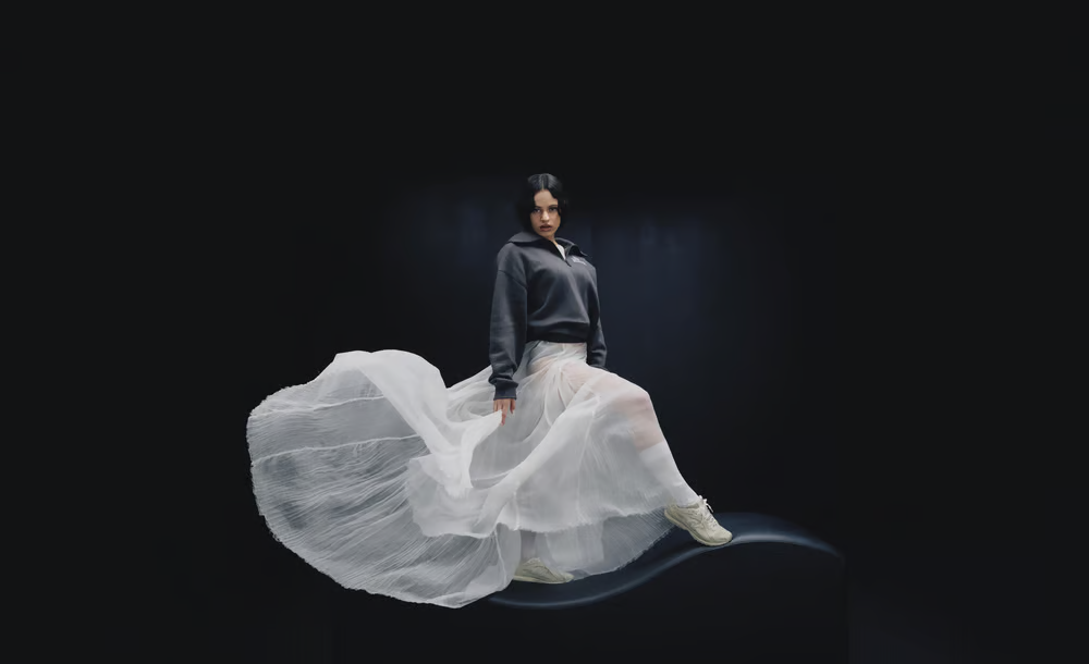 歌手 Rosalía 在 New Balance 的全新广告大片中为运动装扮增添了精致锋芒。自 2025 年起担任该品牌全球大使的她,在片中身着白色透明雪纺裙搭配黑色卫衣出镜。