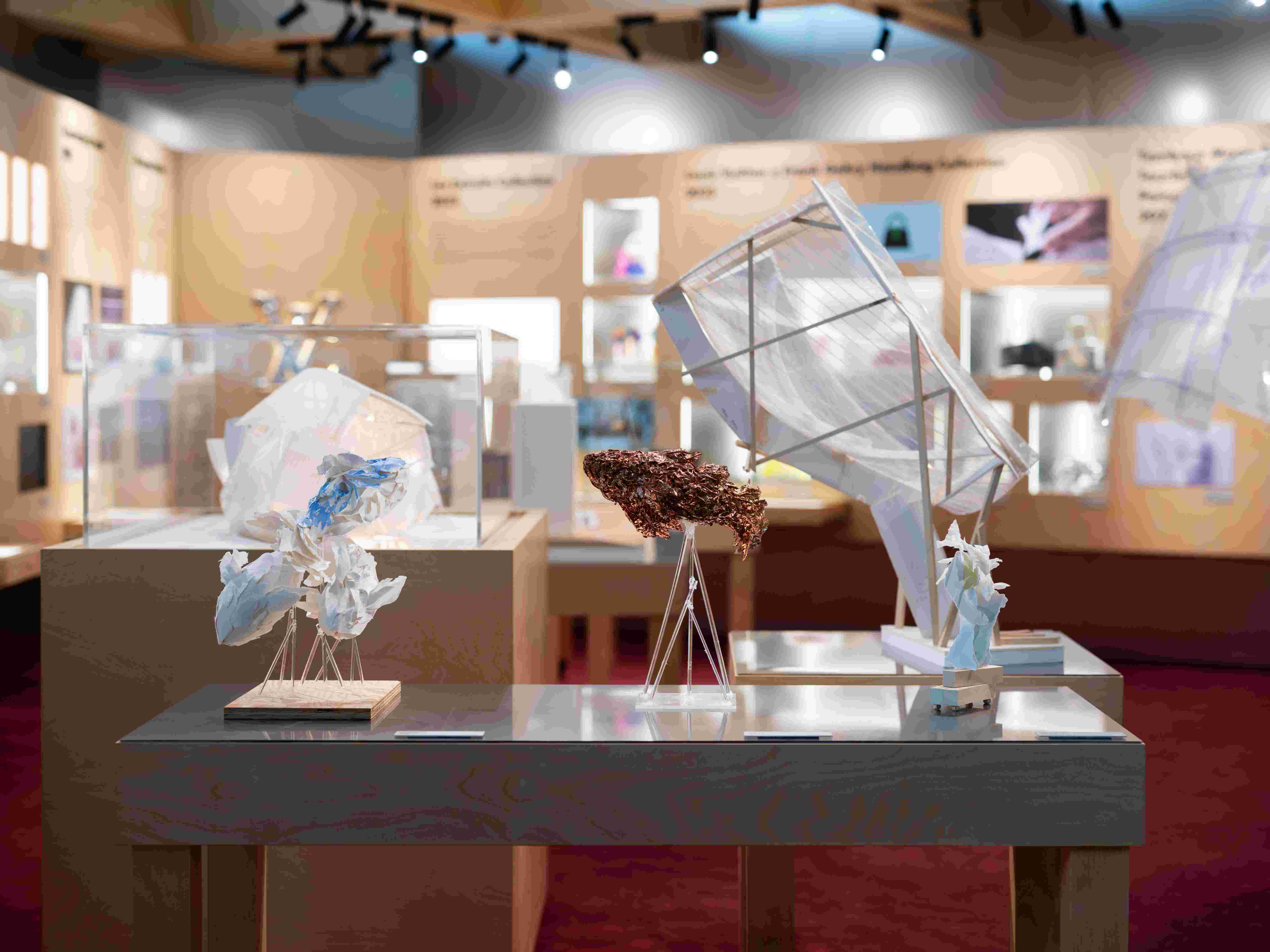 自与路易威登开启合作以来,Frank Gehry便对品牌经典的Monogram帆布图案展现出浓厚兴趣,尤其关注品牌创始人姓名首字母交织的经典元素。这些对Monogram的研究催生了全新的标志性符号,其中一款更成为路易威登x Frank Gehry系列的专属标识。2024年推出的Tambour腕表亦为本次展出的重点之作。这款腕表凝聚路易威登La Fabrique du Temps高级制表工坊的精湛技艺(该工坊汇集品牌核心制表技艺,恪守最纯粹的高级制表传统),并以流畅的雕塑感浮雕设计呼应建筑师的建筑语言。这款腕表采用蓝宝石材质,经雕刻与手工精修而成,表背镌刻着Frank Gehry的签名,作为记录时光流转的物件,生动诠释了Gehry的恢弘建筑视野。