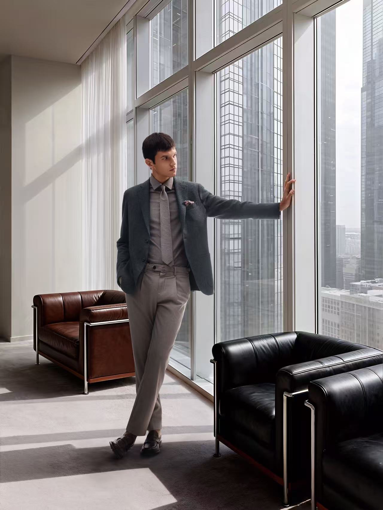 飞行服的故事,始于GENTSPACE和冯唐的一次对话。提到那些跨越海洋与时区的悠长旅途,冯唐笑着分享了他对差旅出行服饰的期望:是否能有这样一件衣服,既能在机舱里如同体贴的旅伴,温暖、舒适又柔软;又能在舱门外化身工作的伙伴,利落笔挺地陪伴他奔赴每一个场合?GENTSPACE读懂了冯唐的期待,进一步洞悉无数都市男性面临的共同难题,即如何在不同身份、状态与场景的切换间,始终兼顾外在的舒适与得体,永葆内心的从容与笃定。于是,一款兼具功能性与设计感的飞行服在GENTSPACE和冯唐的共同探讨中应运而生,可适配不同场景的设计和极具质感的面料令其既可悠然“上天”,又能飒沓“入地”。