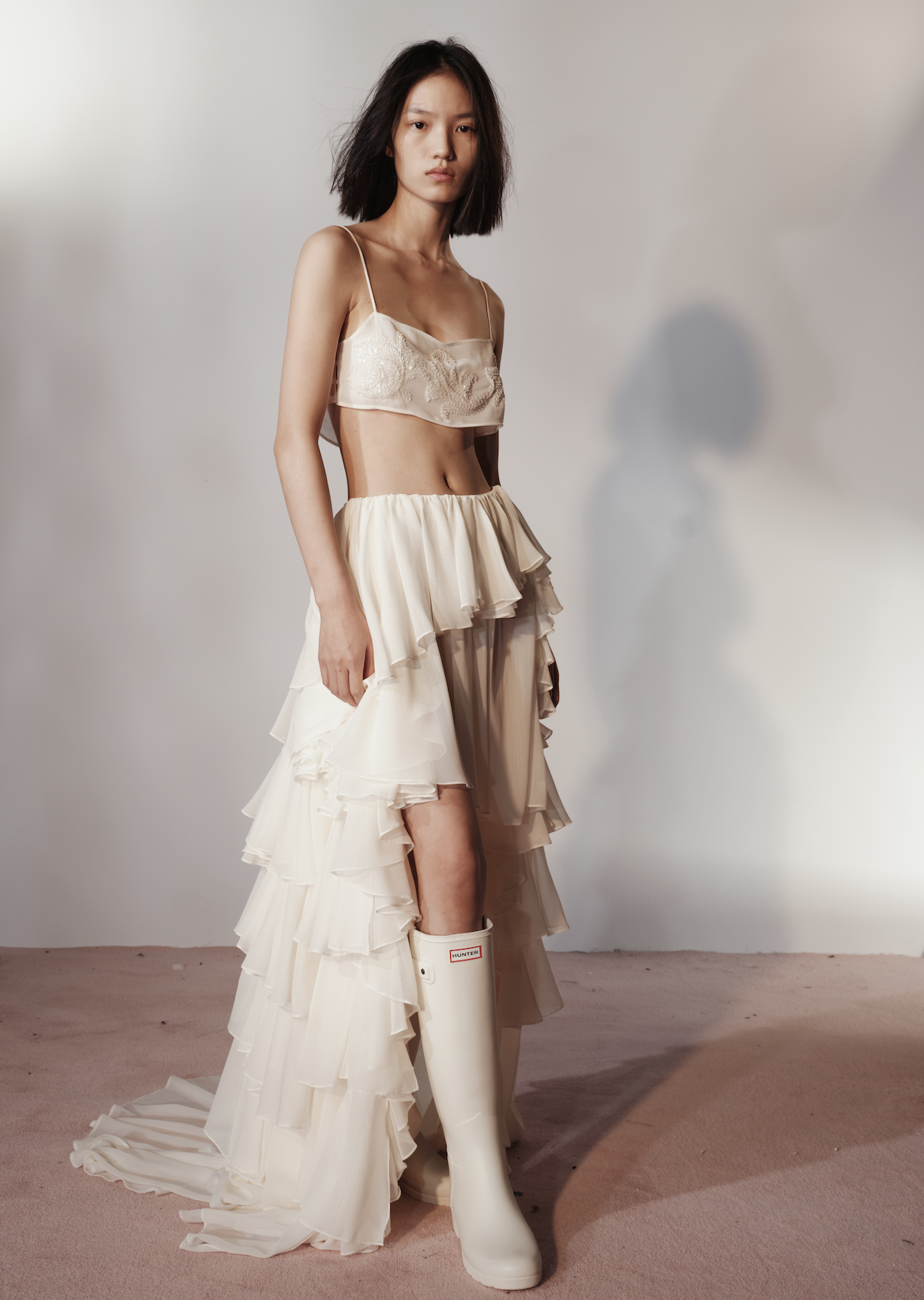 在此次合作中,XU ZHI以8套独特的秀场造型,对HUNTER的经典雨靴进行创意重塑。系列灵感源自法国诗人兰波的诗歌灵魂,探寻浪漫主义与颓美的边界。雨靴为整体秀场形象注入粗旷而实用的探索气息,不仅强化了视觉上的层次感,更暗示着一种不受拘束的旅途精神——仿佛漫游于都市与荒野之间的流浪诗人,巧妙地连接着传统与现代、典雅与不羁。