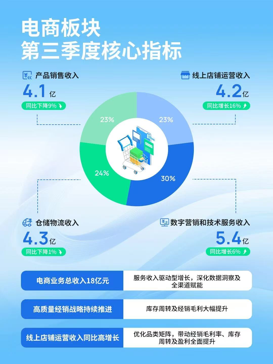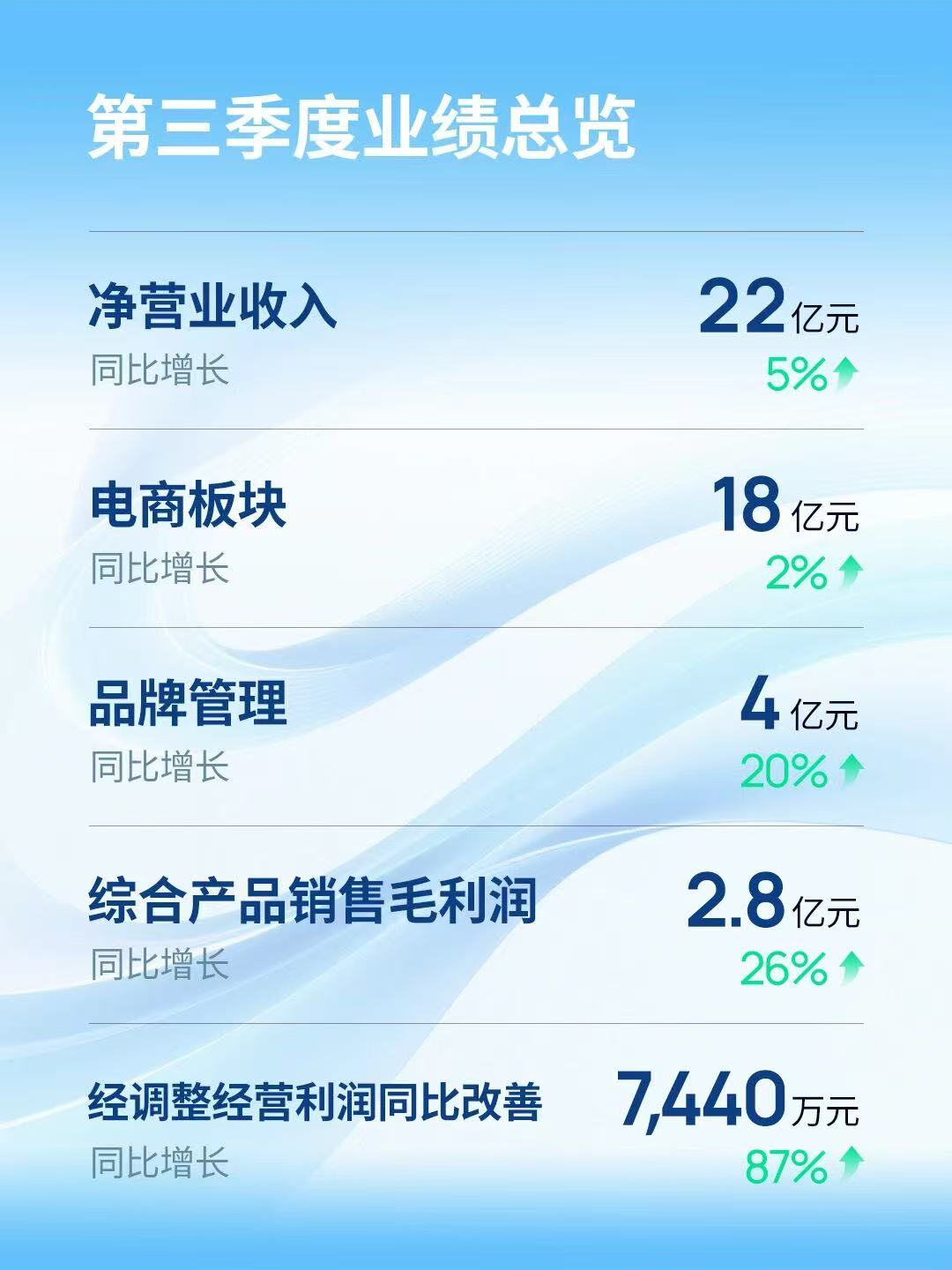 第三季度,宝尊电商业务实现净收入18亿元,同比增长2%。其中,服务收入增长6%至14亿元。通过优化经销模式质量、拓展优势品类、深化全渠道运营体系,以及提升技术驱动的运营效率,构筑起持续增长的坚实基础。非公认会计准则下,电商业务第三季度经营利润2800万元,相比去年同期大幅改善,实现了近年来首次在三季度淡季中的扭亏为盈。