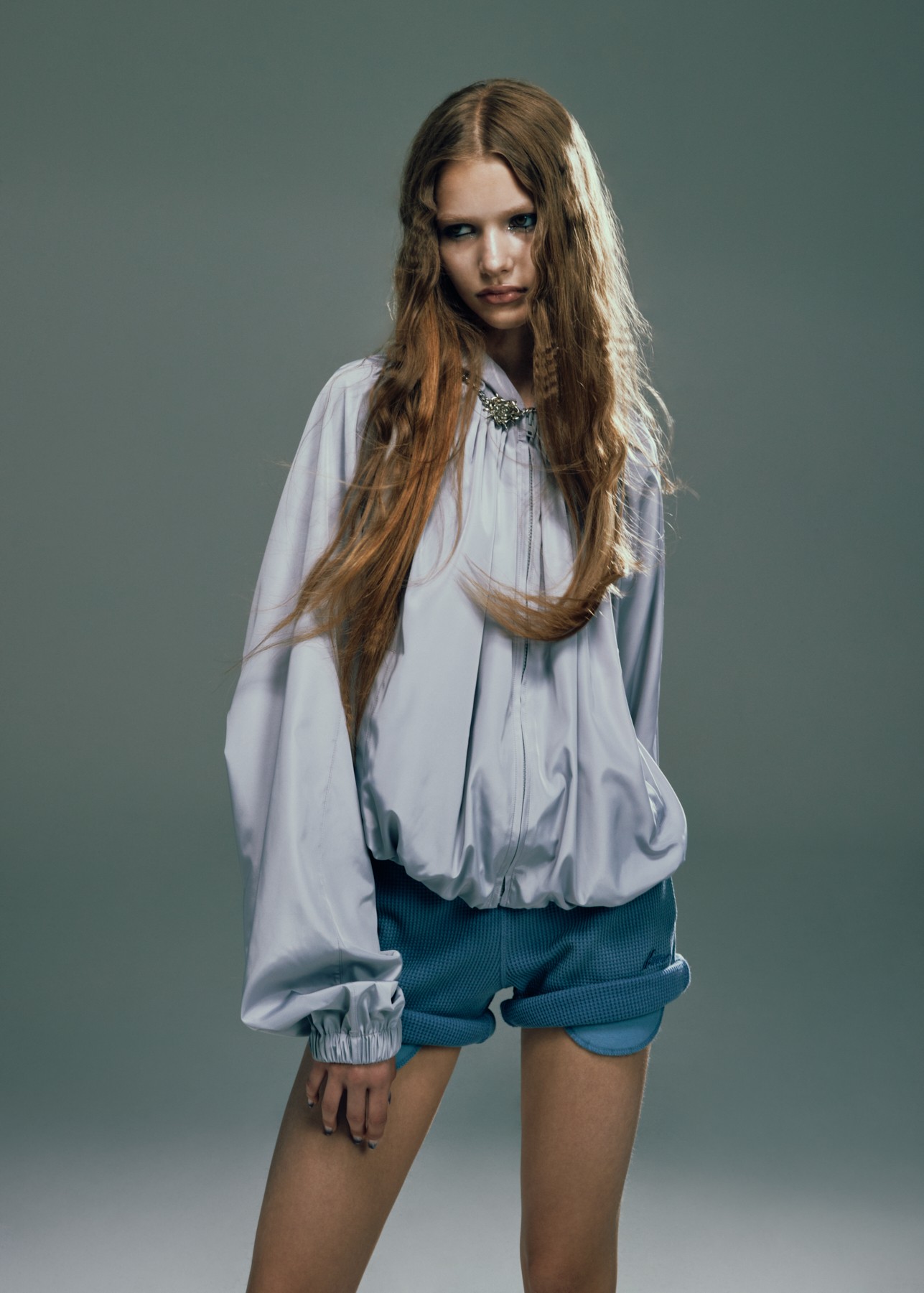 本系列的主角们对沙漏式轮廓情有独钟,从雕塑感抹胸背心到运动夹克,再到腰间微收的超大廓形 Polo 连衣裙,皆展现这一特质。他们亦偏爱充满力量感的肩部设计无论是超大号连帽夹克,还是背部垂坠水晶链条的双排扣大衣,这一设计语言更延伸至剪裁利落的系带衬衫 -- 这款衬衫肩部线条挺括,内置同色系领带,亦可作为迷你裙单穿。玫瑰荆棘安全别针胸针,以及项圈、链条项链等前卫配饰,为这些结构化单品注入一丝暗黑浪漫的优雅注脚。