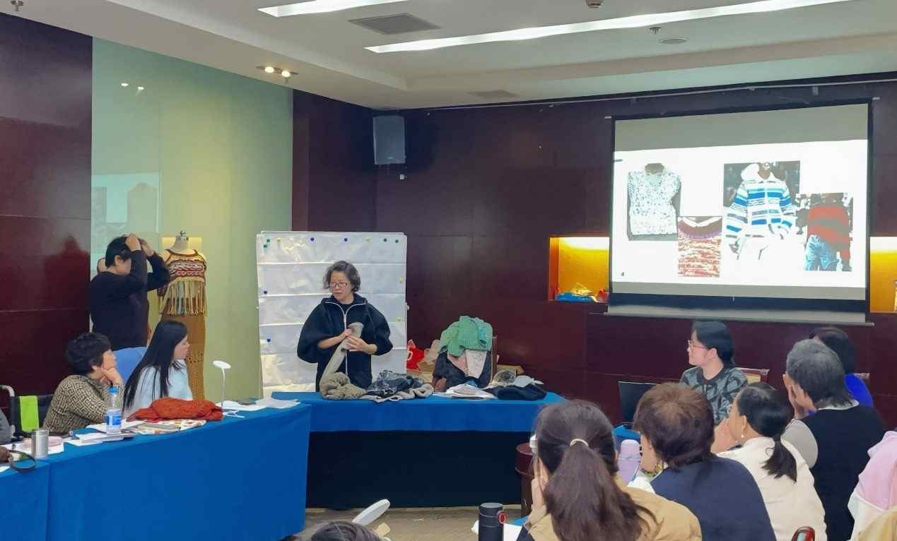 交流会上,江南布衣为本次“美丽工坊”活动组建的专业讲师团队,从工艺与设计双维度提供系统指导。从业 40 余年的毛衫版房主管戚彩琴,详解毛衫打样、大货全流程,涵盖试片确认、尺寸测量、水洗整烫等关键环节,甚至细化到“线圈密度计算”等实操要点;芝麻实验室设计师焦亚楠则围绕廓形设计、材质选择、色彩搭配等内容,分享从设计图稿到成衣落地的全链条逻辑。这些专业指导,既能帮助残疾妇女提升服装领域的核心技能,让手工产品更贴合市场审美与品质标准,也为双方后续商业合作奠定基础 —— 通过标准化工艺与市场化设计,未来“美丽工坊”的手工作品有望接入江南布衣供应链体系,实现从“公益帮扶”到“商业共赢”的跨越。