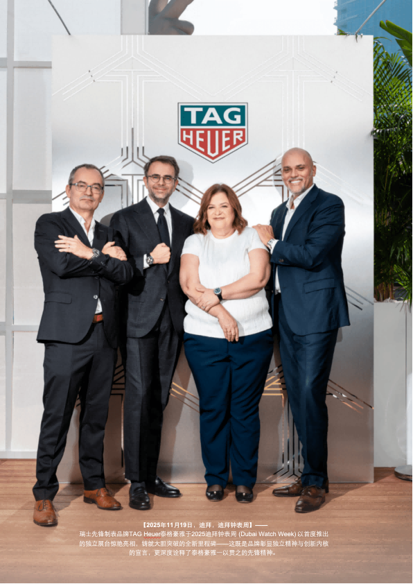 11月19日,迪拜,迪拜钟表周——瑞士先锋制表品牌TAG Heuer泰格豪雅于2025迪拜钟表周 (Dubai Watch Week) 以首度推出的独立展台惊艳亮相,铸就大胆突破的全新里程碑——这既是品牌彰显独立精神与创新内核的宣言,更深度诠释了泰格豪雅一以贯之的先锋精神。