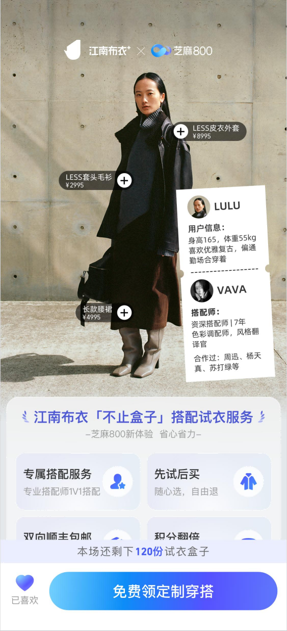 此次江南布衣旗下【BOX+不止盒子】与芝麻信用旗下子品牌芝麻800 携手,响应「芝麻800 · 先试」倡议,为高信用人群特别开通 “信用体验专属通道”:只要芝麻信用分≥800分,即有机会尊享 1 次免费定制搭配试衣服务,以“先试后买”的核心模式,让用户省心、从容地感受原创设计的魅力。