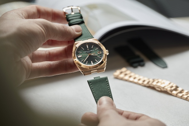 Overseas纵横四海系列自动上链腕表以粉红金材质演绎闪耀美学,为日常生活点缀悦目光彩,亦为优雅赋予全新定义。粉红金的温润光泽与绿色调的深邃色彩相得益彰,予江诗丹顿运动风尚腕表增添一抹艺韵新意,同时也为系列的探索精神再添新意,腕表直径41毫米,以粉红金材质打造,尽显华美珍贵,优雅气质浑然天成。腕表搭载5100机芯,为小时、分钟及秒钟显示提供充沛动能,动力储存达60小时。配以折叠式表扣和三款可替换表带/表链——粉红金表链、皮革表带和橡胶表带,从尊贵格调到都市风尚,轻松满足不同场合的多元需求。