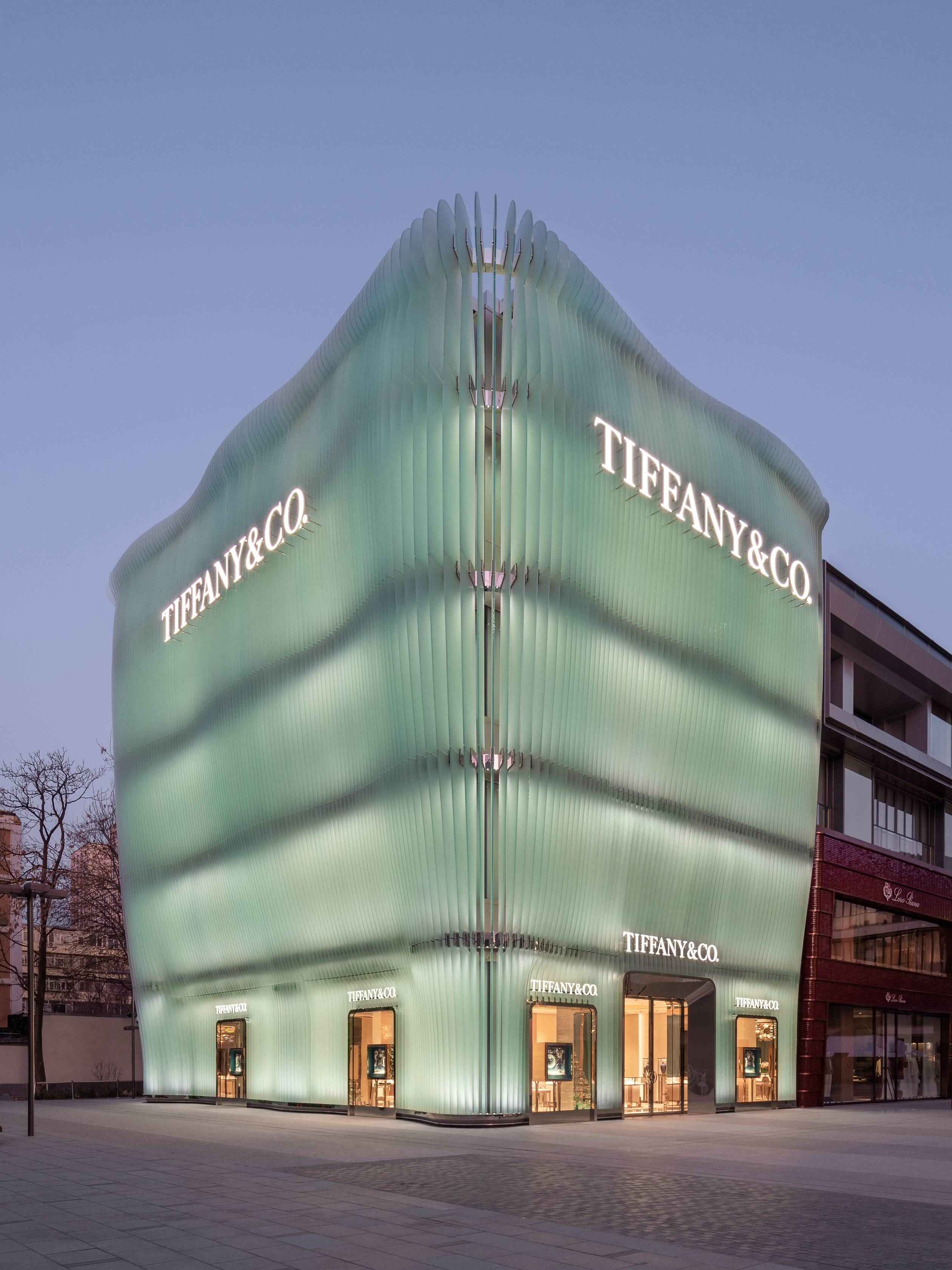 旗舰店外立面由MVRDV建筑事务所设计,灵感源自品牌传奇设计师艾尔莎·柏瑞蒂(Elsa Peretti)经典作品的优雅之美。外立面采用经环保回收并于本地制造的鳍片式玻璃构筑,将诗意律动与几何美感融于一体,并在光影流转间呈现出波浪般的视觉效果与层次渐变的蓝色光泽。这一外立面将蒂芙尼玻璃工艺传承与建筑语言、光影艺术相融合,是品牌隽永特质的当代演绎。