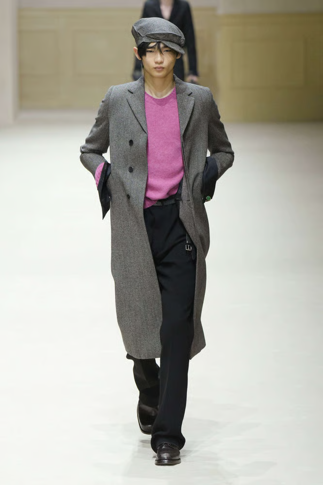 当米兰其他秀场仍被夸张的廓形和体积感占据时,Prada 却反其道而行之,推出了一系列极致纤细、近乎严苛的轮廓。从多尼戈尔粗花呢、午夜蓝斜纹呢到细人字纹,甚至如第二层皮肤般的皮革,大衣被剪裁得极其窄长,下摆收于膝下。