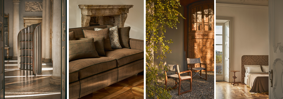 本系列影像取景自十六世纪的潘扎别墅 (Villa Panza) 内部及其周边。这栋别墅坐落在意大利乡间连绵起伏的山峦之中。历经时光淬炼的镶木地板、被微光轻抚的湿壁画、灰泥天花板、修葺齐整的草坪与开阔柱廊,共同构筑了这一叙事场景。沐浴在自然天光下的艺术品与 Loro Piana 室内装饰系列作品,展露低语般的笃定优雅,于材质、空间与时间的静谧对话中被永恒定格。