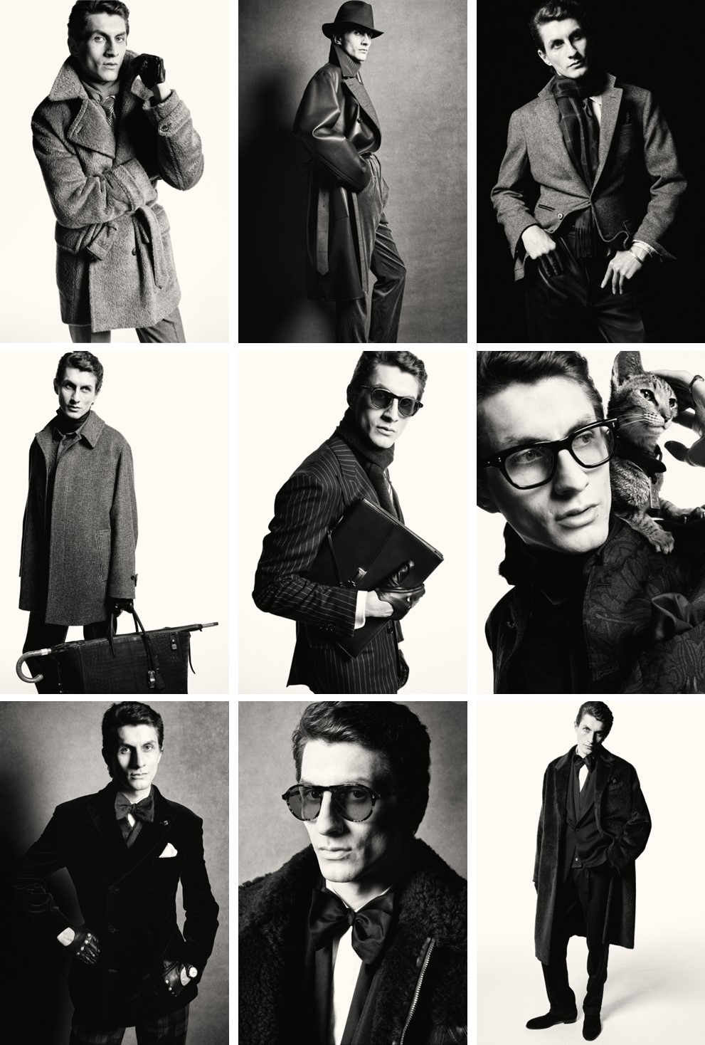 件件华服以渐变灰色调次第展开,超细150支羊毛羊绒混纺法兰绒材质轻若无物,为服饰版型定下基调:多款Bourdon剪裁西装,囊括鲨鱼纹、鸟眼纹与钉头纹面料,可搭配同纹路大衣穿着。配饰选择繁多,既包含色调雅致的茜草红丝质口袋方巾,饰以波点或细腻花卉纹样;臻制光泽条纹款针织丝绸领带,以及格伦格与千鸟格纹丝羊绒围巾。
