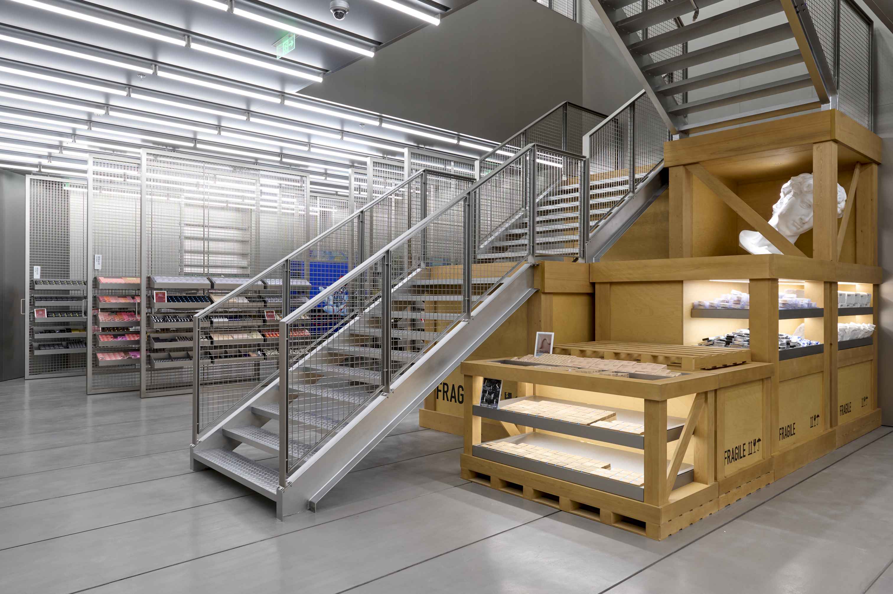 本次焕新门店以金属与玻璃骨架营造轻盈开放的场域,将艺术品与美妆产品在极简框架中共同陈列,打造兼具艺术策展氛围与零售功能的复合美学空间。室内依托焕新后的双层结构,形成连贯的探索路径,消费者可于门店入口处领取观展手册,依循手册指引在空间中自由漫步,实现观展与购物的深度融合。