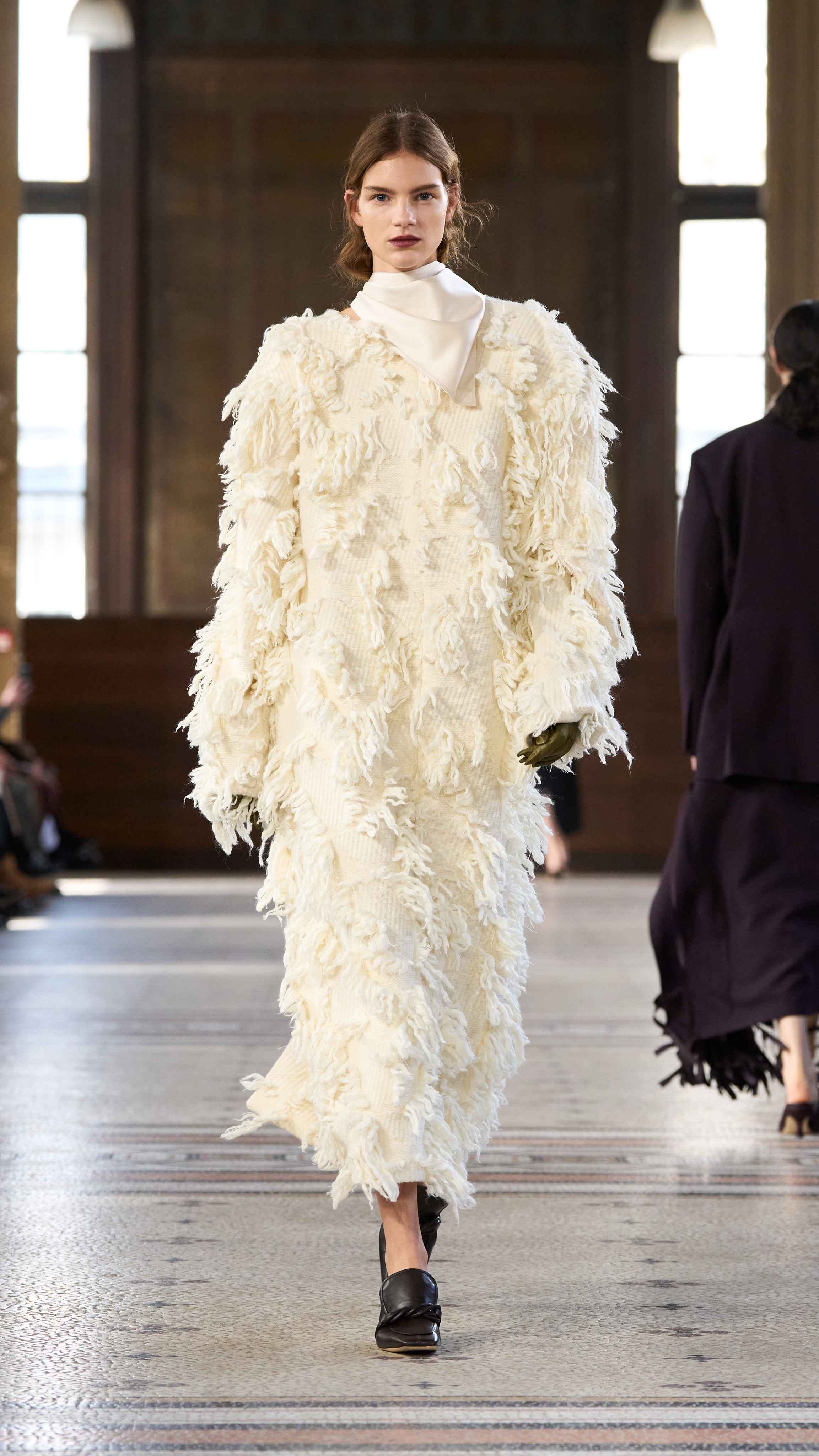 系列始于制服式裁剪,精准、权威,近乎严苛。外套的剪裁定义肩线、规整廓形。我从法式寓所的室内装饰中汲取灵感,以消解这份严谨⸺流苏、织物、壁毯、帷幔与毛毯⸺私密空间的元素,暗含松弛、层叠与浸润于日常的优雅。衣着穿行于公共仪式与私密日常之间。1950年代的高级定制,为系列注入雕塑感的女性气质⸺弧形肩缝构筑的圆润廓形,考究腰线,以及对工艺的虔敬。承继上季,我将经典形制以抽象的兰花形态重新诠释⸺花瓣被解构为体量与褶裥,而非具象的花卉再现。由此凝练出一种含蓄的感性符号⸺优雅,性感,兼具建筑感。