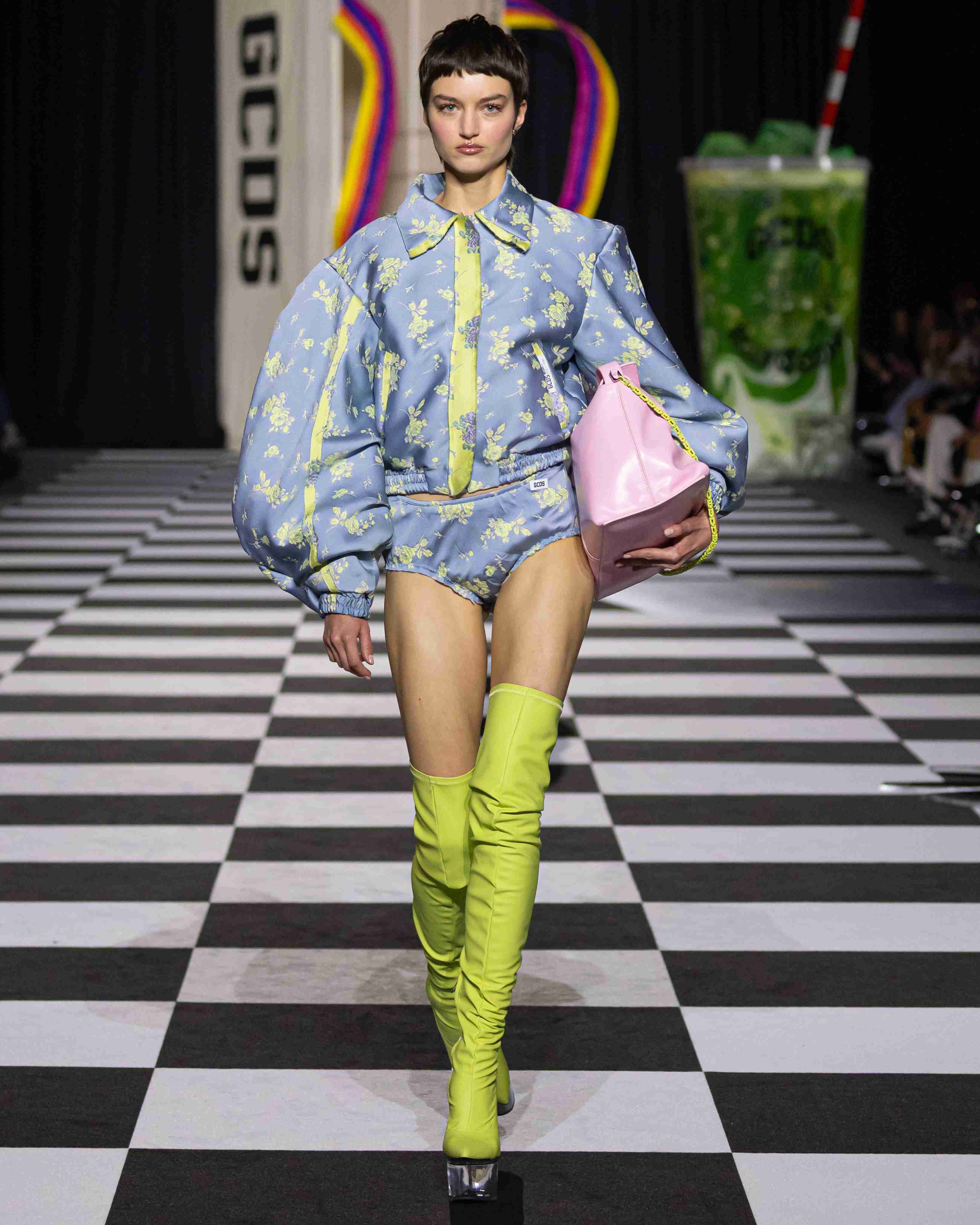 随着模特们从一只超大号GCDS购物袋中缓步走出,大秀第一章如电影闪回般,将人们带回GCDS的早期时光:学院风廓形,如棒球夹克和运动夹克搭配牛仔裤或呈现酸洗柔和色调的百褶裙,唤起品牌玩趣十足的初登场记忆。