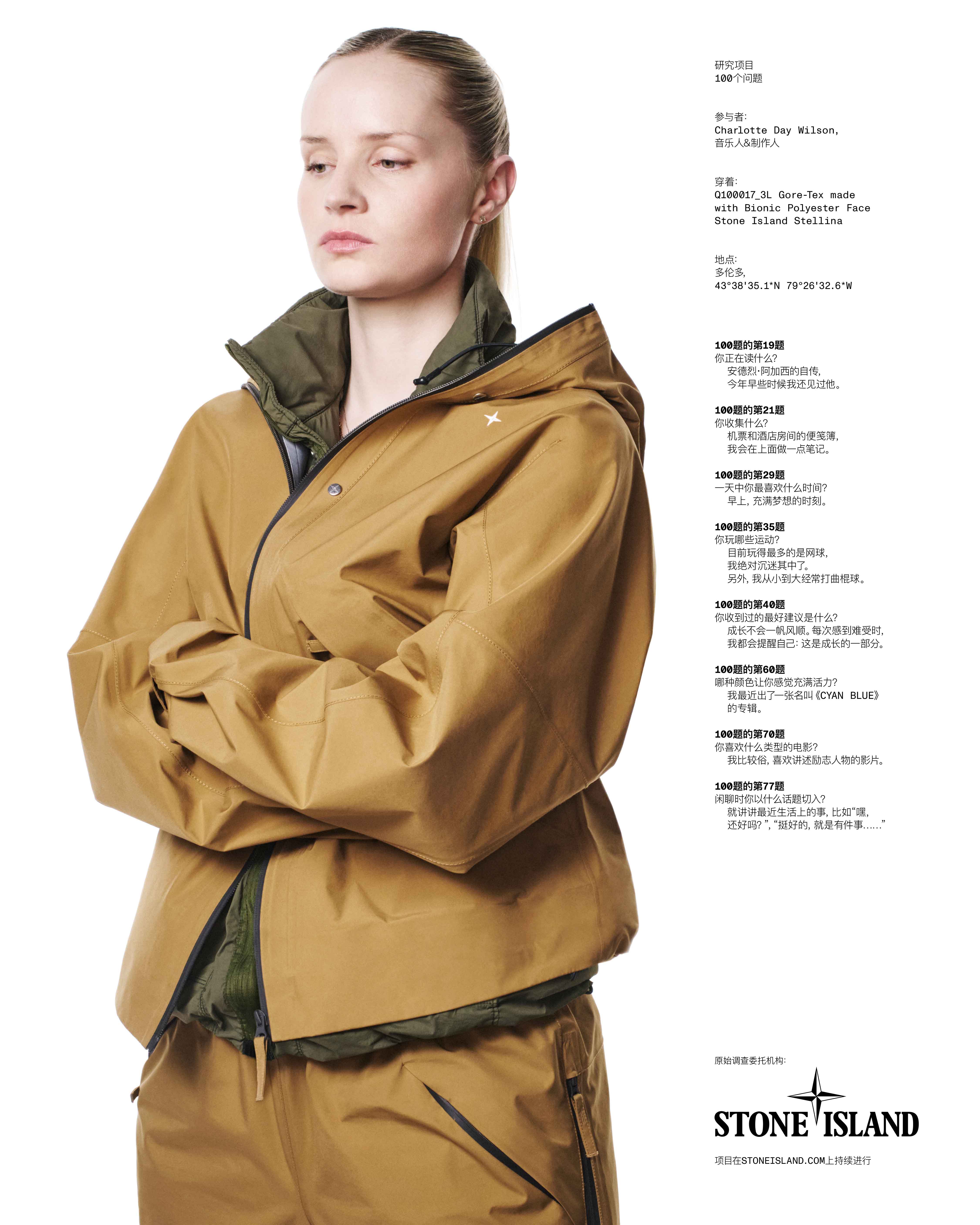 2025年9月26日,音乐人兼制作人Charlotte Day Wilson穿着Q100017 3L GORE-TEX MADE WITH BIONIC POLY_STONE ISLAND STELLINA连帽夹克,采用GORE-TEX高性能面料的,由BIONIC聚酯帆布制成,配有多个拉链口袋,袖口可调节松紧。透气、防水、防风。