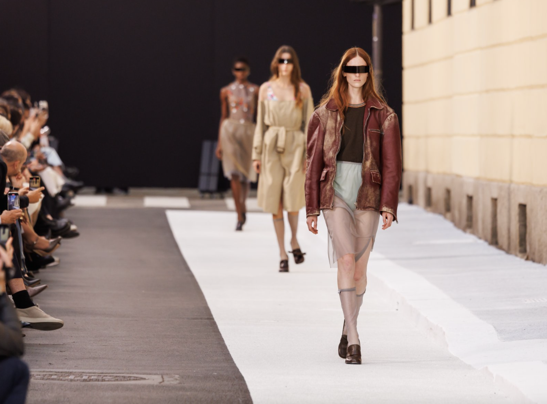 街头万象皆可成景,即兴即法则:围兜式设计、泳装外穿、衬裙单穿呈现吸睛造型。经典款式如风衣、裤装套装、短夹克、衬衫与长裤亦未曾缺席,但设计风格突破传统品类界限:牛仔裤拥有西裤的剪裁细节,西裤则融合了牛仔的随性气质。水洗标签外露与原始毛边设计注入时尚新意,透明嵌片营造错视镂空效果,流光质感丝袜亦采用了这一别致设计。