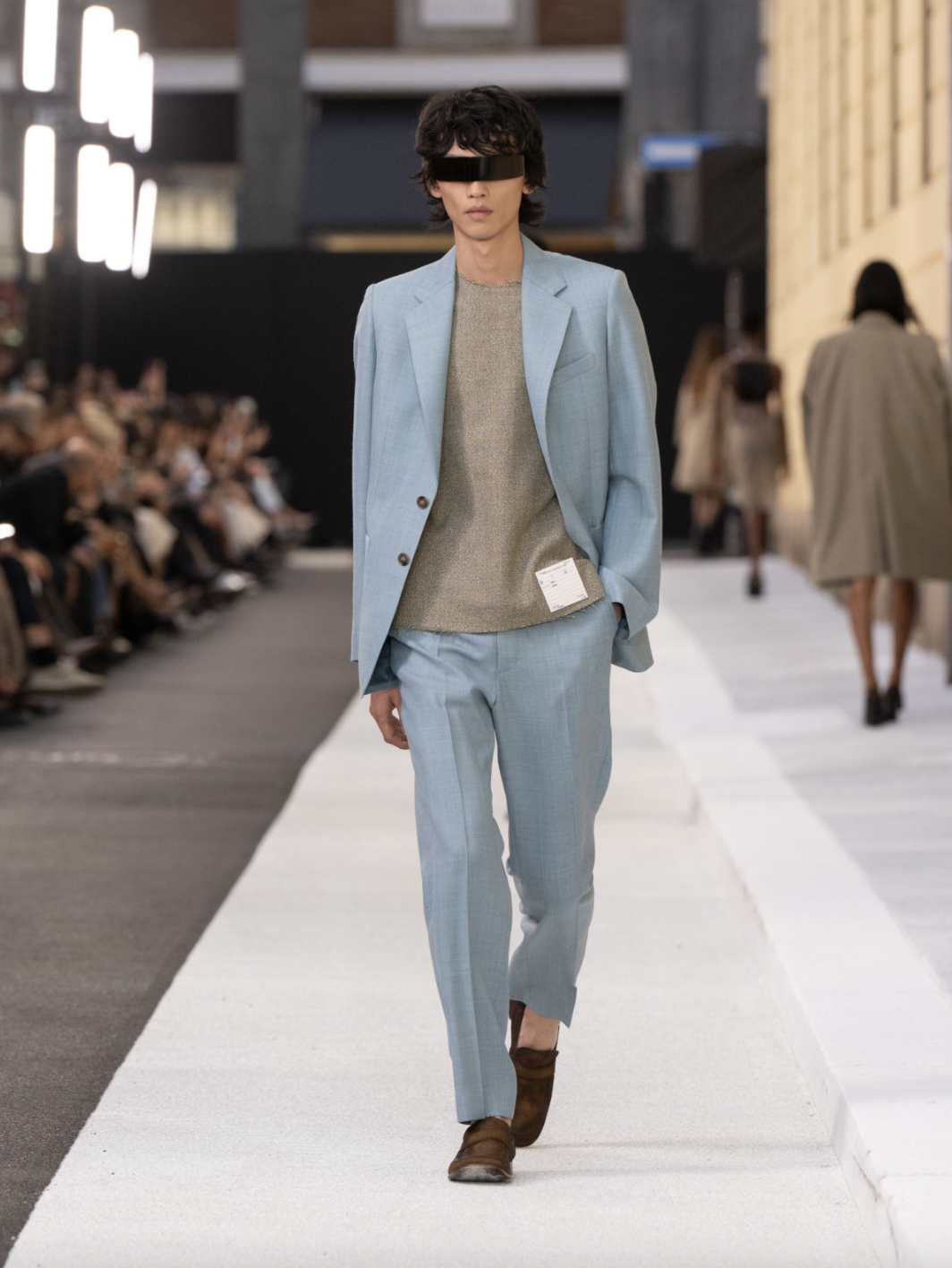 便利贴色、无色彩、中性色与印花交织成丰富的视觉谱系。隐藏式纽扣传递恰到好处的得体感,真实与幻象的博弈持续延展。衣物防尘罩化身为短夹克、连衣裙、大衣和斗篷,重塑标志性风格符号。肩线前推勾勒独特体态,衣摆短而利落。全新两件套以同色系大衣叠搭连衣裙。