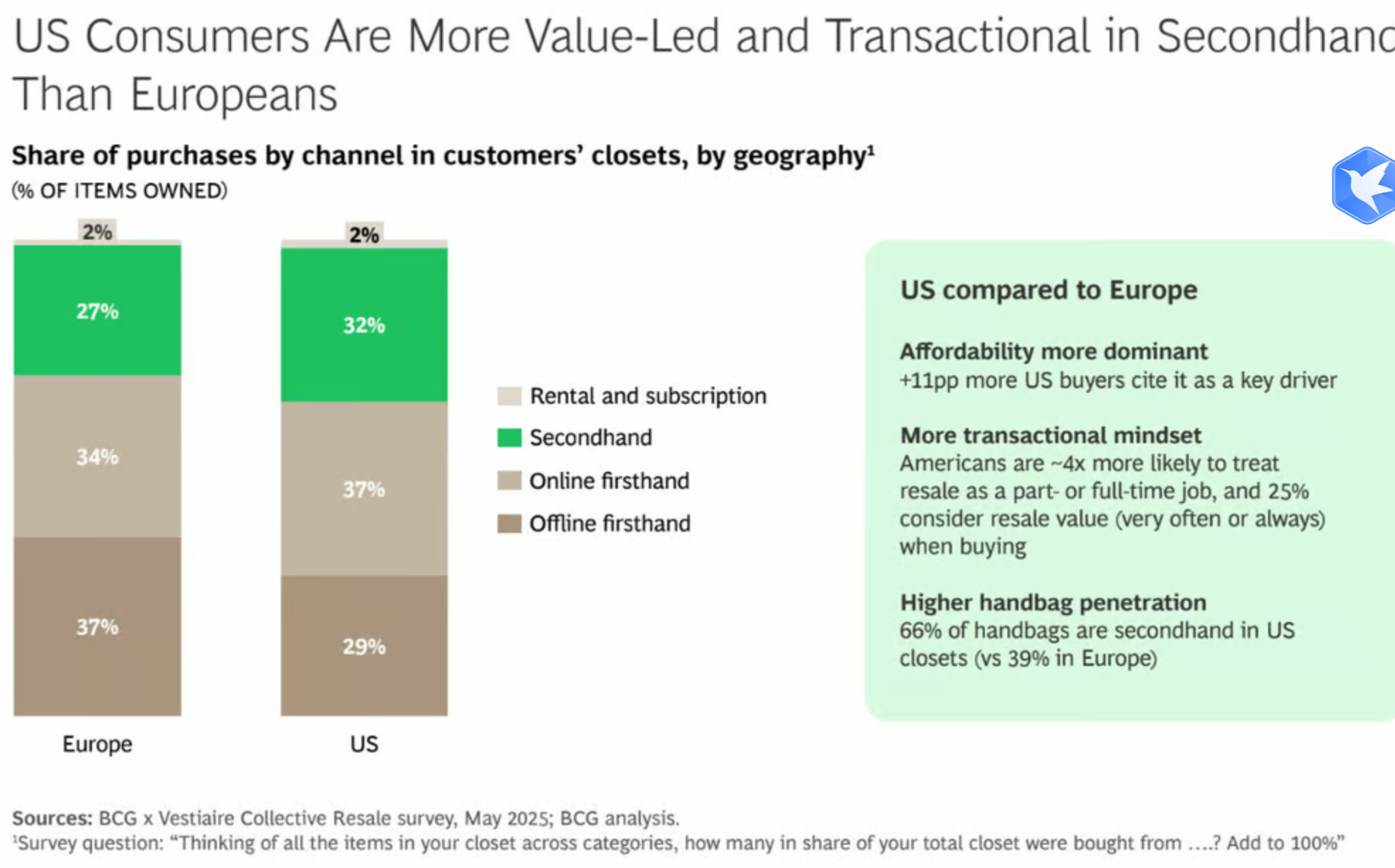 研究还揭示了欧洲与美国市场的显著差异。对于 Z 世代而言,二手单品已占衣橱的 32%,其中 手袋类产品的二手占比在美国高达 66%,而欧洲仅为 37%。美国消费者更注重价格与交易价值,87% 的受访者 将“实惠”视为购买二手的主要原因,而在欧洲,这一比例为 76%。成立于 2009 年的 Vestiaire Collective 是全球领先的高端与奢侈时尚转售平台,2024 年营收突破 10 亿欧元,并于近期正式推出专属男装品类,持续扩大其在全球二手奢侈品市场的版图。