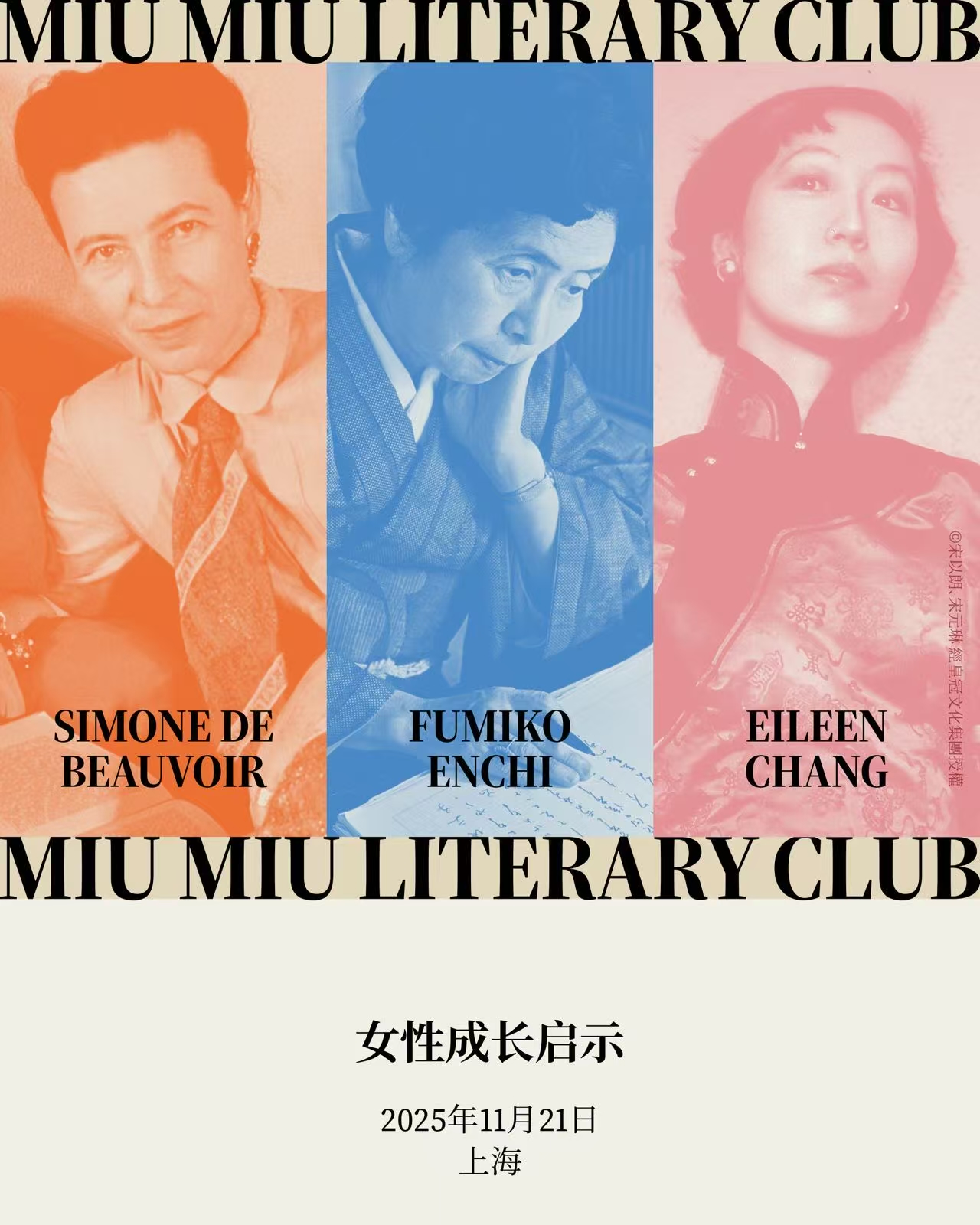 Miu Miu 文学俱乐部(Literary Club)即将首次登陆上海举办。以“女性成长启示”(A Woman’s Education)为主题,探讨三位女性文学大师的作品:法国存在主义学者西蒙娜·德·波伏瓦(Simone de Beauvoir);日本昭和时代最杰出的女性作家之一圆地文子(原名上田富美)以及中国现代文学的卓越代表张爱玲。受欧洲文学沙龙与艺术家社群的悠久传统所启发,Miu Miu文学俱乐部于2024年在米兰启动,通过文字映照今昔女性的生命图景。Miu Miu文学俱乐部上海站活动延续Miu Miu致力于推进当代思想进步与文化教育的立意。