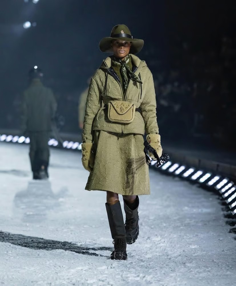 在拥抱美式文化的同时,Moncler 并未忘记其欧洲根源。系列中大量运用了阿尔卑斯山区的传统材质:Loden 羊毛面料作为山地传统生活的基石,Loden 与粗花呢占据了视觉重心;领口与裤兜处的精细花卉手工缝制,呼应了传统山地服饰中的“宁静诗意”。