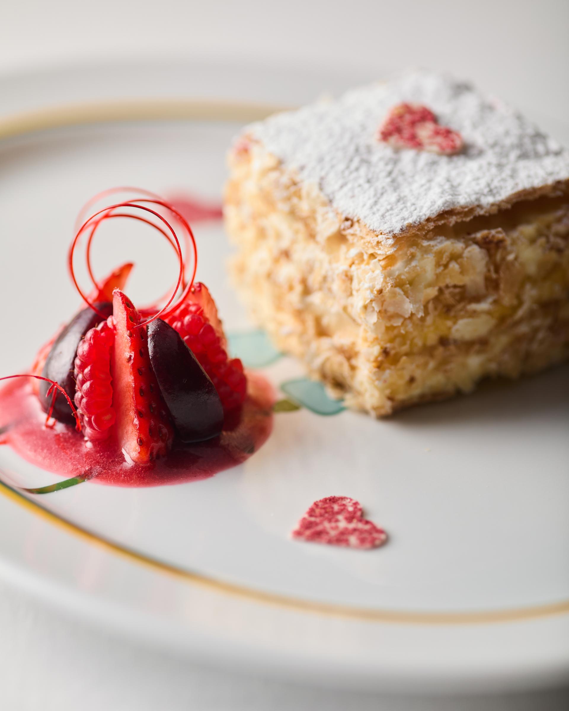 晚宴菜单亮点包括:吉他弦意面配帝王蟹与新鲜香草、烤牛里脊配黑松露汁、土豆泥及田园时蔬。晚宴尾声,多款融合巧克力与时令鲜果的精致甜点登场,以优雅平衡的味觉层次为盛宴画上句点。